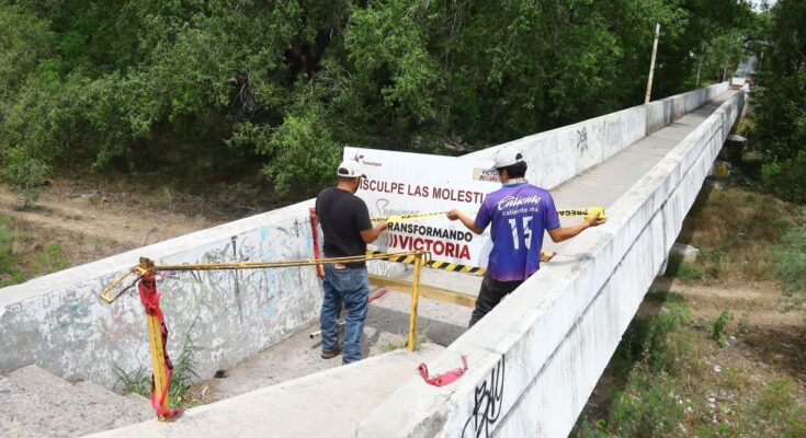 Cd. Victoria, 2 de mayo 2025. – La Secretaría de Obras Públicas del Municipio, inició este viernes trabajos de reconstrucción de la base de estructura metálica del puente peatonal del 13 boulevard.