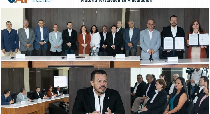 El C. P. Guillermo Mendoza Cavazos, rector de la Universidad Autónoma de Tamaulipas (UAT), presidió la firma del convenio de colaboración con el Colegio de Contadores Públicos de Ciudad Victoria, mediante el cual se fortalecerán acciones en beneficio del alumnado, docentes e investigadores de la Facultad de Comercio y Administración Victoria (FCAV).