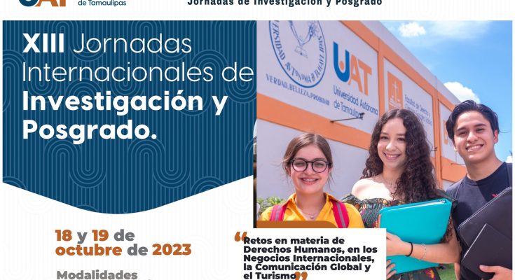 La Facultad de Derecho y Ciencias Sociales Victoria (FDCSV) de la Universidad Autónoma de Tamaulipas (UAT) invita a participar en las XIII Jornadas Nacionales de Investigación y Posgrado denominadas «Retos en materia de derechos humanos en los negocios internacionales, comunicación global y turismo», que se realizarán de manera presencial y virtual los días 18 y 19 de octubre de 2023.