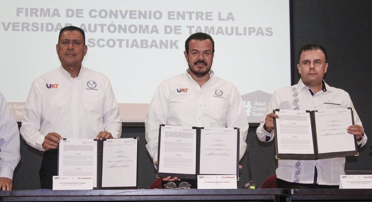 En el Campus Tampico se llevó a cabo la firma de un convenio de colaboración que presidió el rector Guillermo Mendoza Cavazos con la institución financiera Scotiabank, para seguir fortaleciendo el fondo destinado al personal docente de carrera al servicio de la UAT.