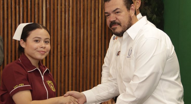 El rector de la Universidad Autónoma de Tamaulipas (UAT), C.P. Guillermo Mendoza Cavazos, presidió la ceremonia de entrega de estímulos económicos a estudiantes hijos del personal académico, que se distinguieron por su alto promedio durante el período escolar 2023-1 de esta casa de estudios.